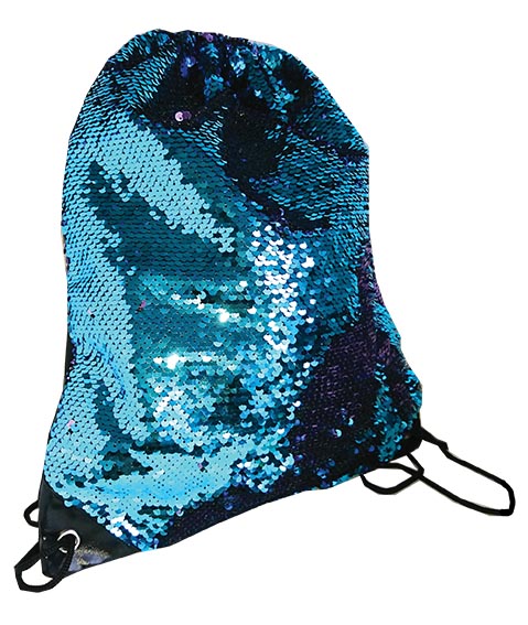 Worek z dwustronnymi cekinami fioletowo-niebieskimi. Worek ściągany jest na sznurki, które jednocześnie tworzą szelki, dzięki czemu worek da się założyć na plecy. Idealny na strój gimnastyczny, obuwie, czy szkolną wycieczkę.