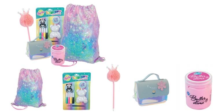 Zestaw zawiera: worek cekinowy, Pandę Squishy, długopis, portfelik Glossy Flower, Butter Slime.