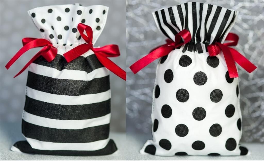 Worek na prezenty w biało-czarne, połączone ze sobą motywy grochów i pasków, o wymiarach 20x30 cm, wykonany jest z tkaniny z foliowym wkładem.