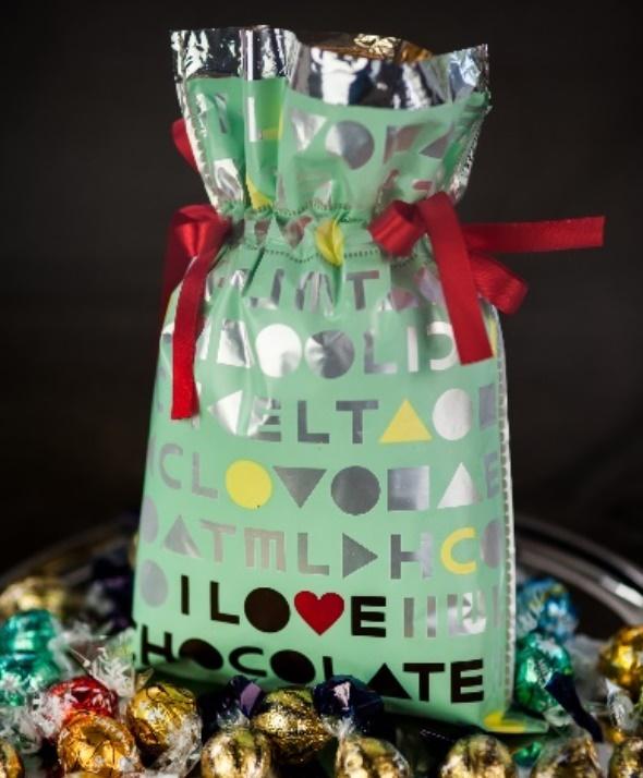 Worek w kolorze miętowym, z nadrukiem I LOVE CHOCOLATE, o wymiarach 20x30 cm, wykonany jest z folii plastikowej z foliowym, srebrnym wkładem.
