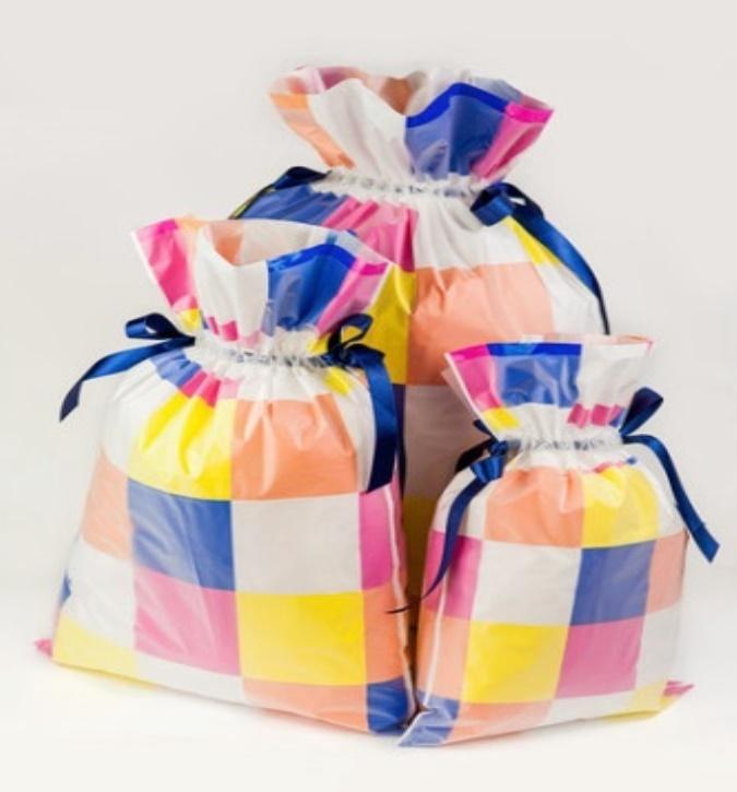 Worek na prezenty w kwadraty w różnych żywych kolorach, o wymiarach 40x56 cm wykonany jest z plastikowej folii.