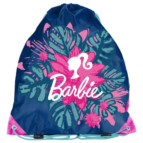 Worek na buty Barbie w kwiaty. Worek zamykany jest ściągaczem, dzięki czemu dostęp do zawartości jest łatwy i szybki. Podwójny ściągacz umożliwia noszenie worka na plecach lub na ramieniu.