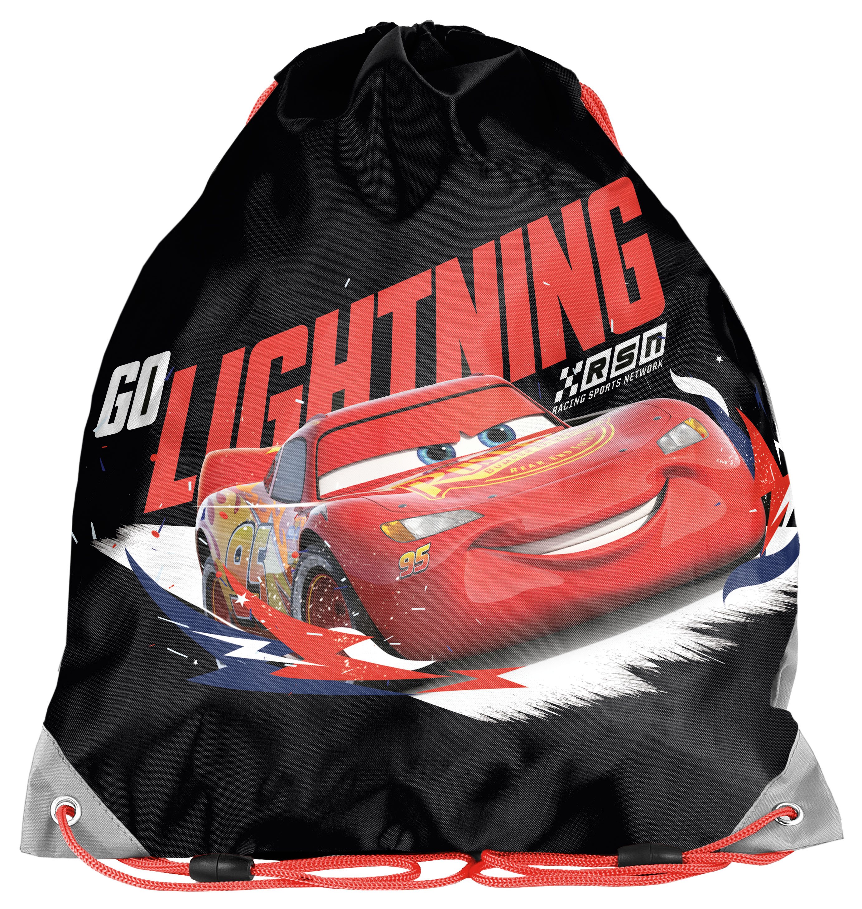 Worek na buty Cars czarno-czerwony. Worek zamykany jest ściągaczem, dzięki czemu dostęp do zawartości jest łatwy i szybki. Podwójny ściągacz umożliwia noszenie worka na plecach lub na ramieniu. Jeśli Twoje dziecko jest fanem wyścigówki Zygzak Mc Queen to worek na buty Paso sprawi mu ogromną radość.