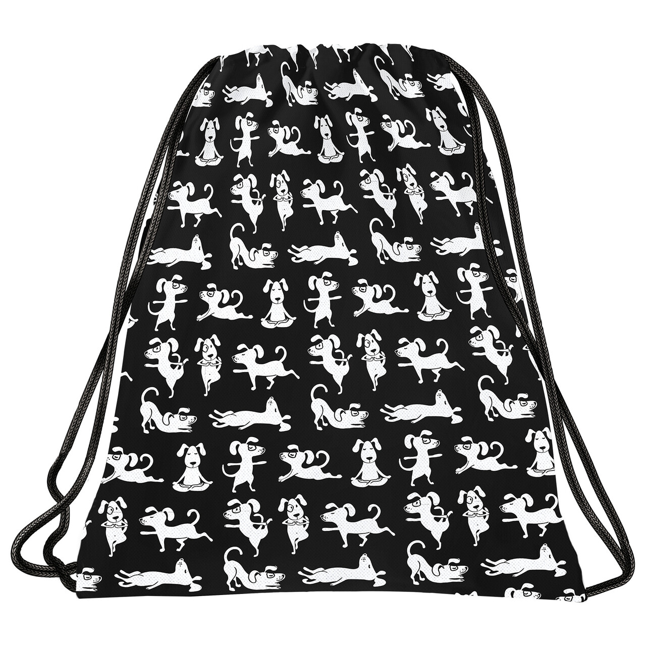 Czarno - biały worek w zabawne szczeniaki w asanach, takich jak pies z głową w dole.