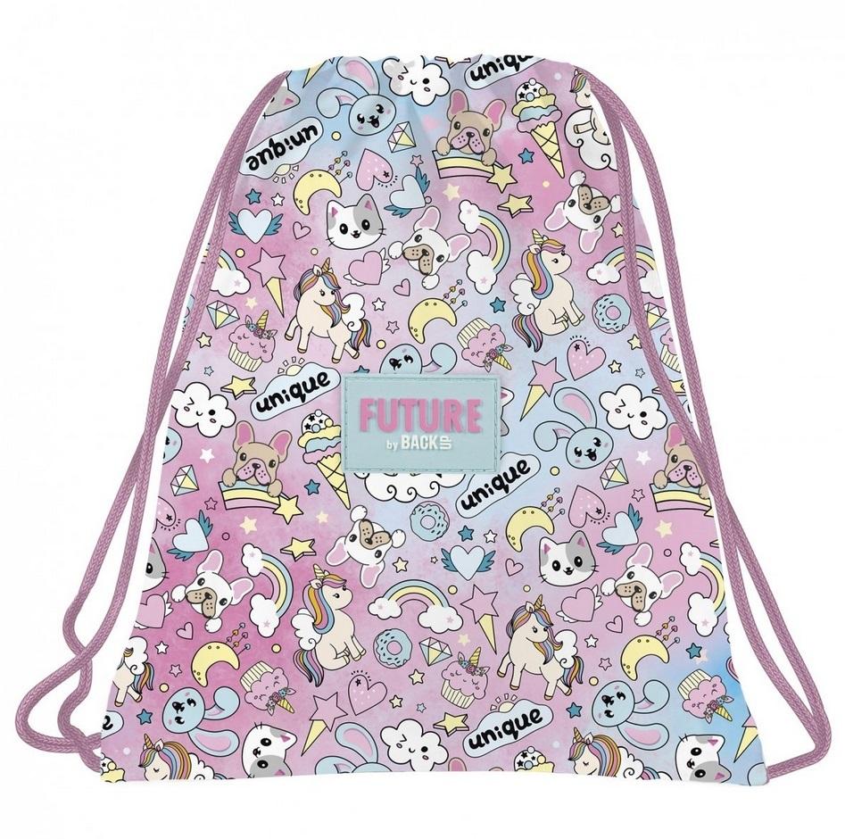 Worek na obuwie, idealny na szkolne treningi i na basen. Dwustronny, posiada podwójne boczne sznurki, które umożliwiają noszenie worka w rękach, na ramieniu czy na plecach. Na odwrocie znajduje się miejsce do wpisania danych osobowych dziecka.