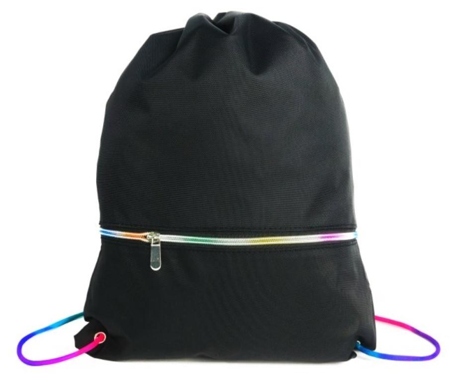 Worek na obuwie lub gimnastykę z dodatkową kieszenią zamykaną na zamek błyskawiczny oraz tęczowymi sznurkami.