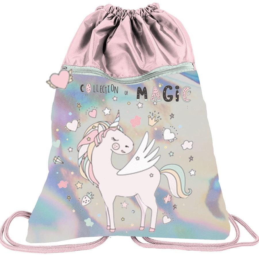 Holograficzny worek na buty. Worek zamykany jest ściągaczem. Posiada grube, plecione sznurki ściągające, umożliwiające noszenie worka na plecach lub na ramieniu. Wyposażony jest w dodatkową kieszeń na zamek. Tył worka jest usztywniony i pokryty siatką.