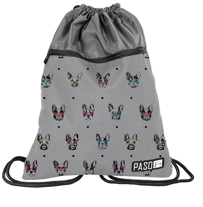 Worek na obuwie szary w pieski. Worek zamykany jest ściągaczem, dzięki czemu dostęp do zawartości jest łatwy i szybki. Wyposażony jest w dodatkową kieszeń na zamek, w której można zmieścić kilka niezbędnych drobiazgów. Grube, plecione sznurki ściągające, umożliwiają noszenie worka na plecach lub na ramieniu. Tył worka jest usztywniony i pokryty siatką. W Paso sięgamy po atrakcyjne wzornictwo, nie zapominając o tym, by oferować solidne i praktyczne produkty, które sprawdzą się w każdych warunkach. Waga: 200 g Rozmiar: 47x37 / kieszeń 37x31