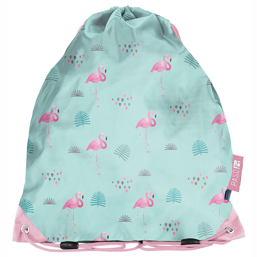 Worek na buty flamingi. Worek zamykany jest ściągaczem, dzięki czemu dostęp do zawartości jest łatwy i szybki. Podwójny ściągacz umożliwia noszenie worka na plecach lub na ramieniu.