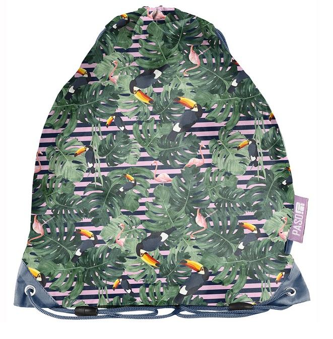 Worek na buty w kolorowe kwiaty. Worek zamykany jest ściągaczem, dzięki czemu dostęp do zawartości jest łatwy i szybki. Podwójny ściągacz umożliwia noszenie worka na plecach lub na ramieniu.