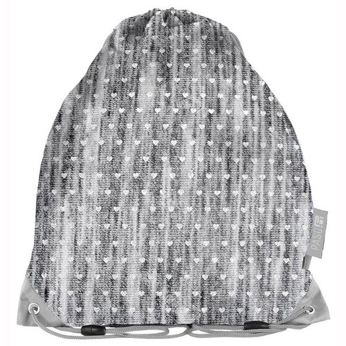 Worek na buty szary w serca. Worek zamykany jest ściągaczem, dzięki czemu dostęp do zawartości jest łatwy i szybki. Podwójny ściągacz umożliwia noszenie worka na plecach lub na ramieniu.