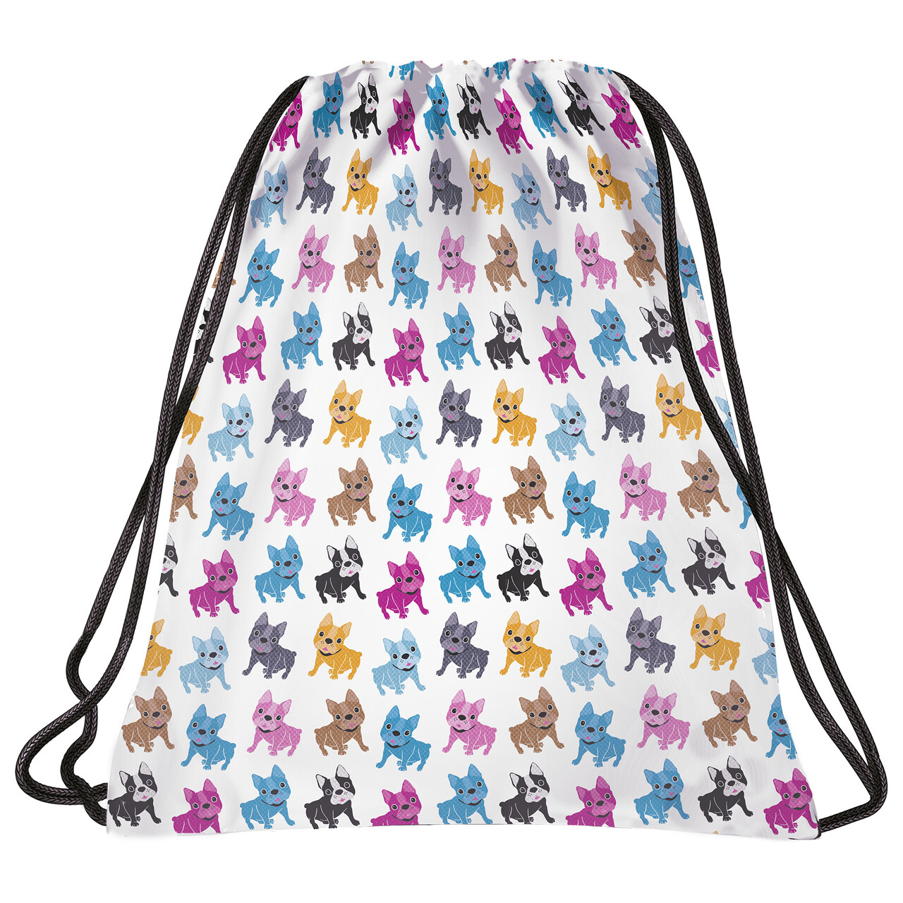 Buldożki francuskie zdominowały świat mody na długi czas. Tak brzydkie, że aż piękne, rozczulają wszystkich, którzy na nie patrzą. Ich charakterystyczne cechy zostały podkreślone intensywnymi, tęczowymi kolorami. Wielobarwne wzory idealnie współgrają z białym tłem tworząc interesującą całość. Worek na obuwie z uroczymi buldogami to strzał w dziesiątkę dla wszystkich fanów tej rasy i nie tylko! Wybierz worek z ciekawym i kolorowym motywem i wyróżniaj się z tłumu każdego dnia.
