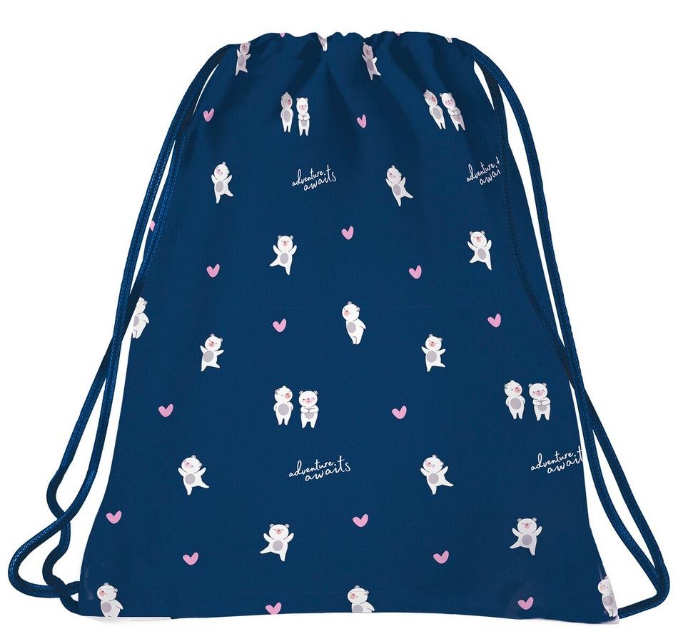 Pełen miłości wzór, gdzie pluszowe niedźwiadki, przeplatane serduszkami tulą się do siebie. Worek na obuwie w granatowym kolorze, ozdobiony uroczymi, zakochanymi misiami w zabawnych pozach. Głęboki granat idealnie współgra z białym i różowym kolorem. Pozytywny, słodki motyw wprowadzi Cię w doskonały nastrój każdego dnia. Białe niedźwiadki zapraszają byś wyruszył z nimi w poszukiwaniu przygód. Adventure awaits!