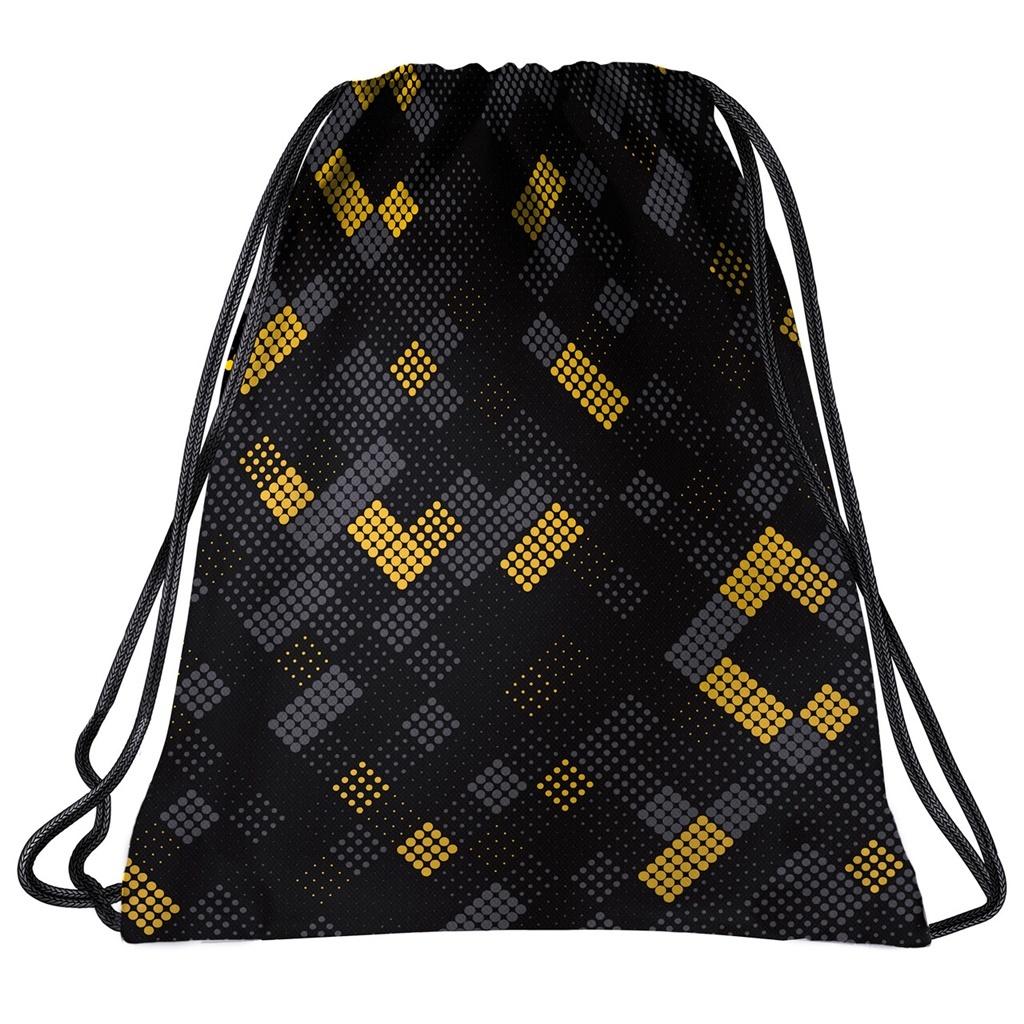 Czarny worek na obuwie w żółte i szare punkciki, które układają się w geometryczne kształty, tworzą w całości niesamowity motyw! Kontrastowy, żółty kolor dodaje charakteru. Worek jest bardzo stonowany, a jednocześnie ma w sobie coś intrygującego. Dodatkowo nie trzeba się martwić, że będzie widać na nim jakieś zabrudzenia.