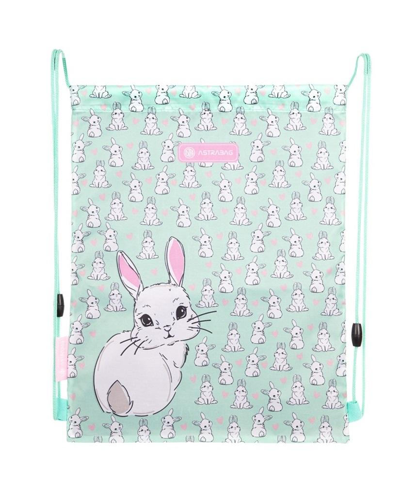 Miętowy worek na obuwie, dla dziewczynki z królikami od wysokiej klasy marki AstraBag. Doskonały do przechowywania odzieży na zajęcia sportowe.
