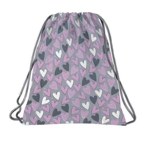 "Szary worek w różowe, białe i ciemno szare serduszka. Wnętrze: Worek na obuwie, z długim sznurkiem, który umożliwia korzystanie z worka jak z plecaka. Rozmiar 41 x 35 cm waga: 33g