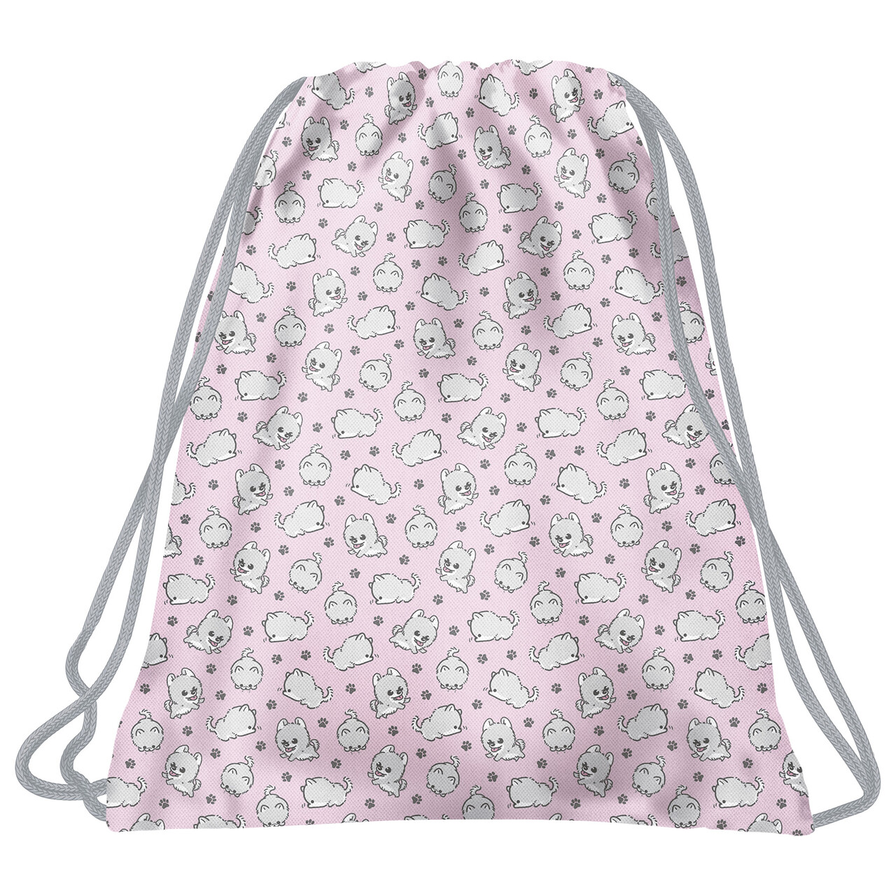 Pastelowy róż w połączeniu z szarymi detalami i urokliwymi, niezdarnymi pieskami - czy można wymarzyć sobie lepszy worek na buty dla dziewczynki? Niesforne, białe psiaki prezentują przeróżne sztuczki, które wywołają uśmiech na dziecięcej twarzy. Taki futrzany przyjaciel to skarb! Worek BackUP: