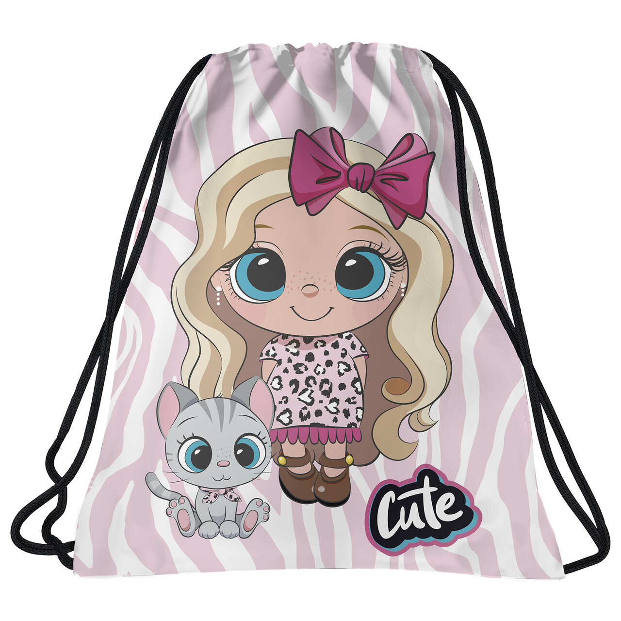 Dwustronny, posiada podwójne boczne sznurki, które umożliwiają noszenie worka w rękach, na ramieniu czy na plecach.