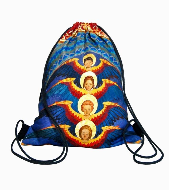 Worek na plecy z tyłem w kolorze ciemnego granatu, zadrukowany oryginalną, niepowtarzalną grafiką w pięknych barwach, przedstawiającą fragment polichromii autorstwa Tadeusza Popiela, znajdującej się w bazylice Franciszkanów w Krakowie.