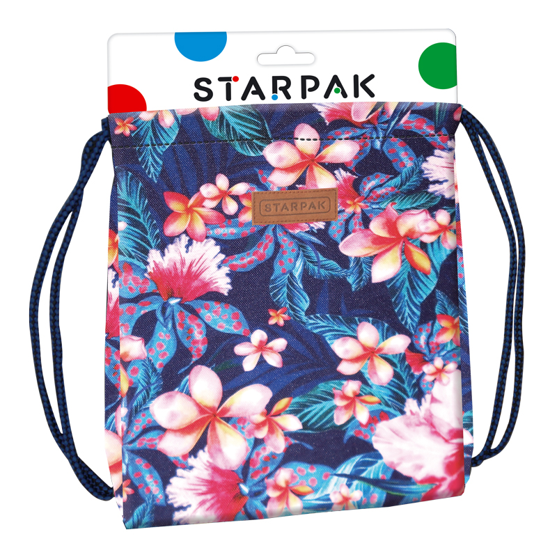 Wielofunkcyjny worek szkolny nie tylko na buty. Główna komora jest wyściełana podszewką. Wytrzymały materiał pokryty kwiatowym, młodzieżowym wzorem. System sznurków umożliwia wygodne noszenie worka w dłoni, na ramieniu, a także jak plecak. Na zewnątrz worka znajduje się niewielka kieszonka zamykana na zamek.