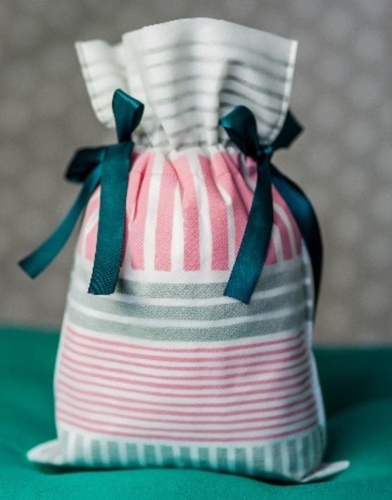Worek na prezenty w pastelowe paski, o wymiarach 20x30 cm, wykonany jest z tkaniny z foliowym wkładem.