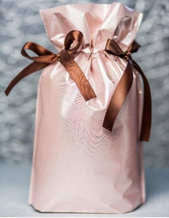 Elegancji dodaje błyszcząca wstążka, w kolorze brązowym, kontrastującym z kolorami worka. Dzięki niej w prosty sposób zapakujemy prezent, delikatnie pociągając z każdej strony.