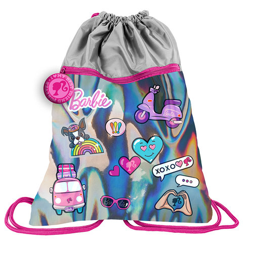 Worek na obuwie z efektem hologramu, dodatkowa kieszeń na zamek, sznurki ściągające, możliwość założenia na plecy. Tył worka usztywniony, pokryty siatką.