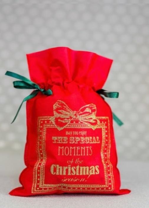 Worek na prezenty w kolorze czerwonym, ze złotym nadrukiem May you enjoy the special moments of the Christmas season, o wymiarach 22x31 cm, wykonana jest z tkaniny.