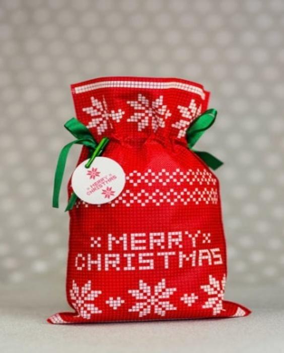 Worek na prezenty w kolorze czerwonym, z klasycznym motywem świątecznym i nadrukiem Merry Christmas, o wymiarach 30x45 cm, wykonana jest z tkaniny.
