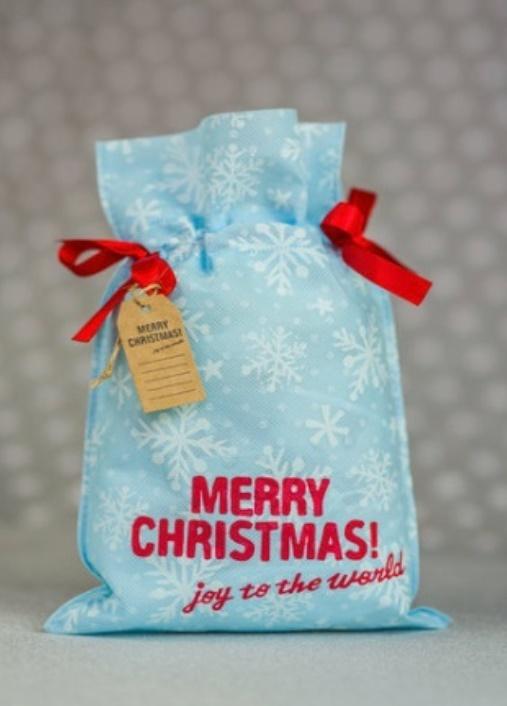 Worek na prezenty w kolorze jasno błękitnym, z motywem białych płatków śniegu i czerwonym nadrukiem Merry Christmas, joy to the world, o wymiarach 20x30 cm, wykonany jest z tkaniny.