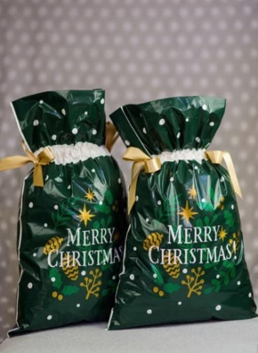 Worek na prezenty w kolorze zielonym ze złotym motywem żołędzi i białym nadrukiem Merry Christmas, o wymiarach 30x45 cm wykonana jest z plastikowej folii.