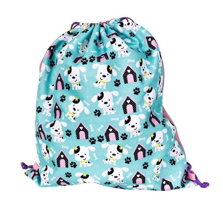 tekstylna torba na kapcie ze ściągaczem, po zaciągnięciu tworzy "ramiączka" - może służyć jako plecak, powierzchnia zadrukowana, rozmiar torby 35 x 42 cm