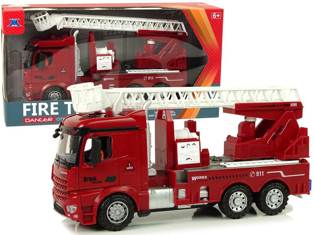 Czerwony wóz strażacki posiada regulowaną drabinę, którą można poruszać w górę i w dół, a także wydłużać ją i skracać. Po za tym można ją obrócić w każdą stronę, co umożliwi dostęp do większości miejsc, a jej zasięg to max 50 cm w górę. Strażak kierowca siedzący w kabinie jest na stałe zamontowany. Na końcu drabiny znajduje się ruchoma platforma, którą może zająć figurka strażaka. Wóz wyposażony jest także w efekty świetlne i dźwiękowe. Przednie światła oraz górne koguty świecą, co umożliwia spostrzeżenie wozu z daleka. Straż posiada frykcyjny napęd tylnej osi na popych, wystarczy nacisnąć na tył, puścić do przodu i cieszyć się prędkością.