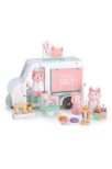 Wóz z mlecznymi koktajlami i lodami, Kitty, Tender Leaf Toys Poznaj Kitty i jej pracowitą rodzinę! Ta wesoła rodzina kotków prowadzi uroczą mobilną knajpkę czyli popularny food truck ze zdrowymi koktajlami i owocowymi lodami! Przez okienka po trzech stronach kociego białego pojazdu Kitty i jej rodzina serwują pyszne koktajle mleczne i lody, zapraszając wszystkich na smakowitą ucztę. Zestaw zawiera także składane tło, które uzupełnia scenerię i otwiera jeszcze więcej możliwości do tworzenia opowieści. Idealny do zabawy w odgrywanie ról, rozwijania wyobraźni oraz doskonalenia umiejętności opowiadania historii!. Merrywood tales to wyjątkowa, bajkowa kolekcja - kwintesencja wyobraźni projektantki marki, łącząca urocze postacie i magiczne detale, które sprawiają, że te zabawki to nie tylko źródło radości, ale i piękne pamiątki na lata. Nasze zabawki produkowane są z drzewa kauczukowego, pochodzącego z kraju położonego na 13 tysiącach rajskich wysp - Indonezji. Do ich pomalowania użyliśmy bezpiecznych i delikatnych farb, dzięki czemu drewno zachowało swój naturalny wygląd i widoczną strukturę. Drewno kauczukowe cechuje się wyjątkową wytrzymałością, co jest niewątpliwym atutem zabawek Tender Leaf Toys. W trosce o naturę, w miejsce każdego drzewa wykorzystanego do produkcji zabawek Tender Leaf Toys, sadzimy nowe drzewo. W Tender Leaf Toys dbamy o zrównoważony rozwój planety i ochronę środowiska naturalnego. Zabawki Tender Leaf Toys tworzone są z myślą o najmłodszych przez brytyjską projektantkę Danielle Hanson, która od lat związana jest z branżą dziecięcą. Dzięki jej doświadczeniu, pasji i niezwykłej wyobraźni, zabawki marki Tender Leaf Toys pięknie odwzorowują detale otaczającego nas świata, jak również dbają o rozwój zdolności manualnych i poznawczych dzieci. Wszystkie etapy produkcji zabawek Tender Leaf Toys odbywają się w jednym miejscu, z najwyższą dbałością o środowisko - w egzotycznej Indonezji, kraju słynącym z poszanowania dla własnej kultury i zasobów naturalnych. Zestaw zawiera: wóz z trzema kołami, okienka na trzech stronach, koktajle mleczne, pączki, lody, składane tło.