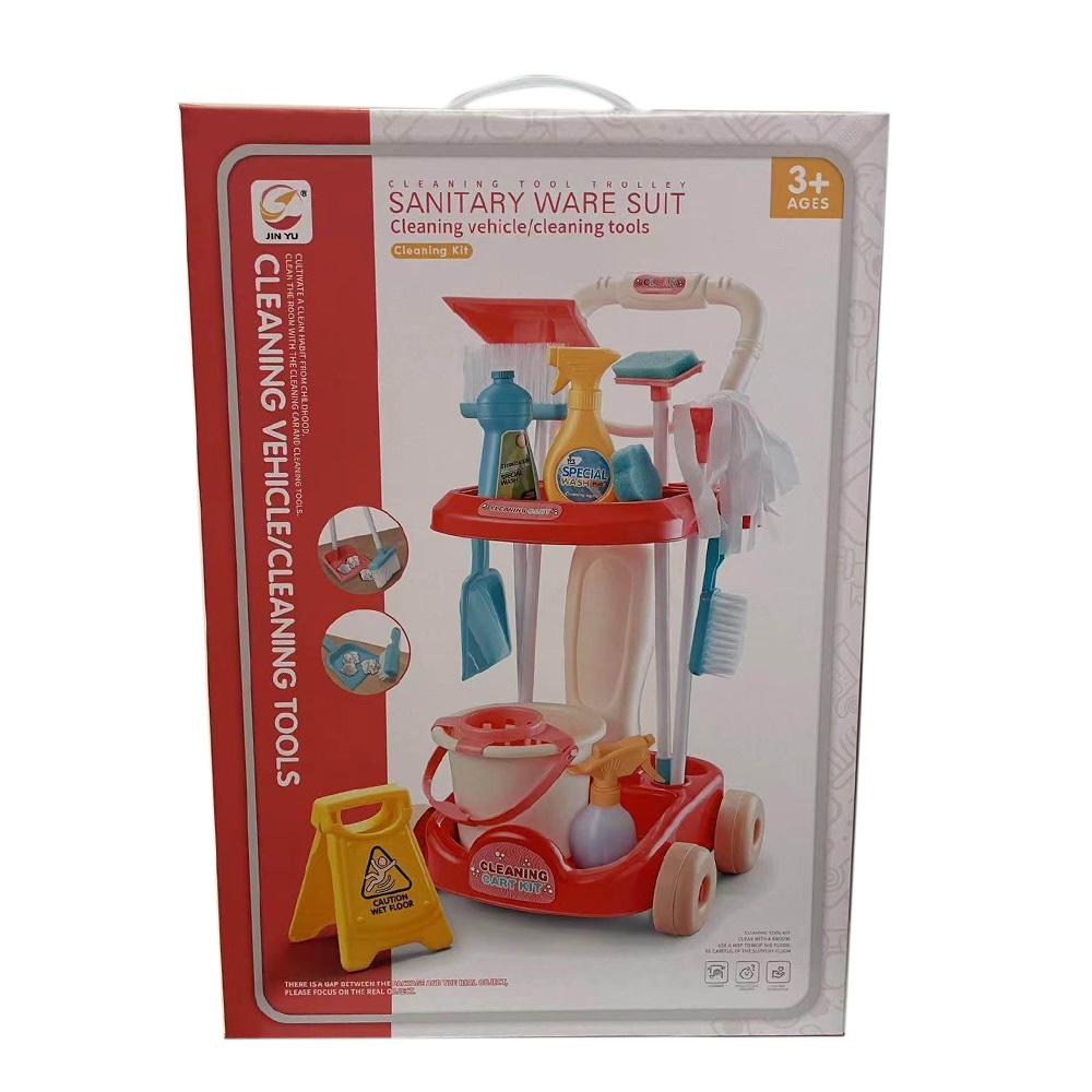 Duży wózek do sprzątania z akcesoriami: szczotka, szufelka, mop, wiadro i różne plastikowe buteleczki. Wymiary opakowania: 41 x 12 x 30 cm