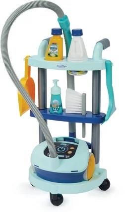 Wózek do sprzątania z 8 akcesoriami w tym: odkurzacz, szufelka, zmiotka, ściągaczka do okien oraz detergenty. Wyprodukowane we Francji. 18 m+