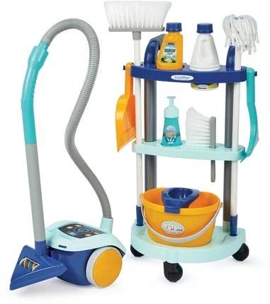 Wózek do sprzątania z 11 akcesoriami w tym: odkurzacz, szczotka, mop, zmiotka, szufelka, ściągaczka do okien oraz detergenty. Wyprodukowane we Francji. 18 m+