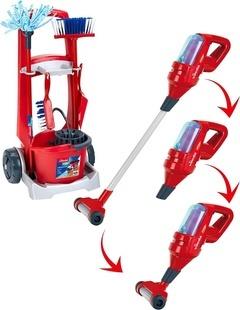 Wózek do sprzątania i odkurzacz powstał na licencji firmy Vileda, dlatego też zestaw jest wierną kopią prawdziwych urządzeń tej marki. Większy element zestawu stanowi czerwony-szary wózek z dużymi kołami oraz rączką do prowadzenia. Wózek jest wyposażony w różnego rodzaju akcesoria, dzięki którym dziecko może uczestniczyć w codziennym sprzątaniu lub naśladować rodziców podczas tej czynności. W zestawie znajduje się czerwone wiaderko z czarnym wyciskaczem mopa, szczotka oraz czerwona zmiotka z szufelką. Zestaw jest łatwy do złożenia, a wszystkie zawarte w nim akcesoria są mini-wersją prawdziwych akcesoriów do sprzątania marki Vileda, dzięki czemu dziecko może robić dokładnie to, co jego rodzice. Mniejszym elementem zestawu jest odkurzacz pionowy (3w1) w kolorze czerwonym z czarnymi elementami i szarą rurą. Rura odkurzacza w dolnej części ma zintegrowany i obracający się podczas kontaktu z podłożem roler w którym umieszczone są w zamknięciu małe plastikowe kulki imitujące wciąganie brudu. Odkurzacz posiada w swojej rączce przezroczysty nierozbieralny zbiorniczek, w którym po włączeniu poruszają się drobne elementy piankowego granulatu. Zabawka przez obracający się silniczek naśladuje także odgłos prawdziwego odkurzacza, dzięki czemu zabawa nim jest jeszcze bardziej realistyczna. Do wyboru po złożeniu mamy aż trzy wersje, gdzie odkurzacz może być używany jako odkurzacz podłogowy, odkurzacz ręczny lub odkurzacz ręczny z ssawką szczelinową. Zabawka posiada wygodny uchwyt, dopasowany rozmiarem do dziecięcych rączek, dlatego zabawa odkurzaczem Vileda jest komfortowa dla dzieci. Wózek do sprzątania z odkurzaczem Vileda to doskonały zestaw dla każdego dziecka, które uwielbia naśladować rodziców podczas sprzątania i z pewnością w krótkim czasie stanie się on ulubioną zabawką dziecka. Dla właściwego działania zabawka wymaga użycia baterii, które nie są dołączone do zestawu. Zabawka wymaga użycia baterii, które nie są zawarte w zestawie.