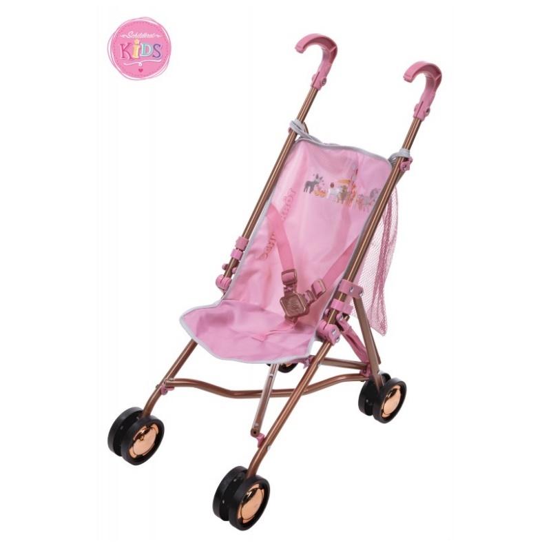 Stelaż wózka to połyskująca, złota konstrukcja. Różowa, mocna tkanina, z której uszyto siedzisko, ozdobiona została charakterystycznymi dla całej koncepcji zabawy produktami tej firmy postaciami zwierzątek - przyjaciół dzieci i laleczek. Szelki pozwalają na przypięcie lali i zabezpieczenie jej przed zsunięciem się z siedziska. W wózku można przewozić lalki o wysokości do 50 cm. Ważnym dodatkiem do spacerówki jest siatka, zaczepiona do uchwytów. Dziewczynki mogą wrzucić do niej niezbędne, drobne akcesoria do zabawy.