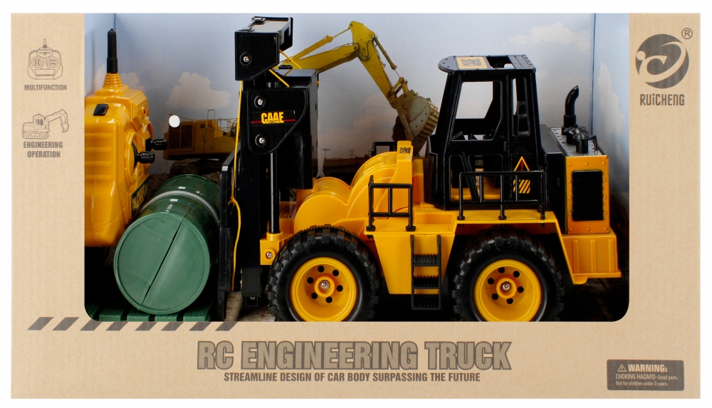 Samochód posiada efekty dźwiękowe oraz świetlne, posiada odgłos odpalania oraz pracy silnika, potrafi jeździć do przodu i do tyłu, za pomącą odpowiedniego przyciska widełki wózka jeżdżą góra i dół, sterowany za pomocą pilota.