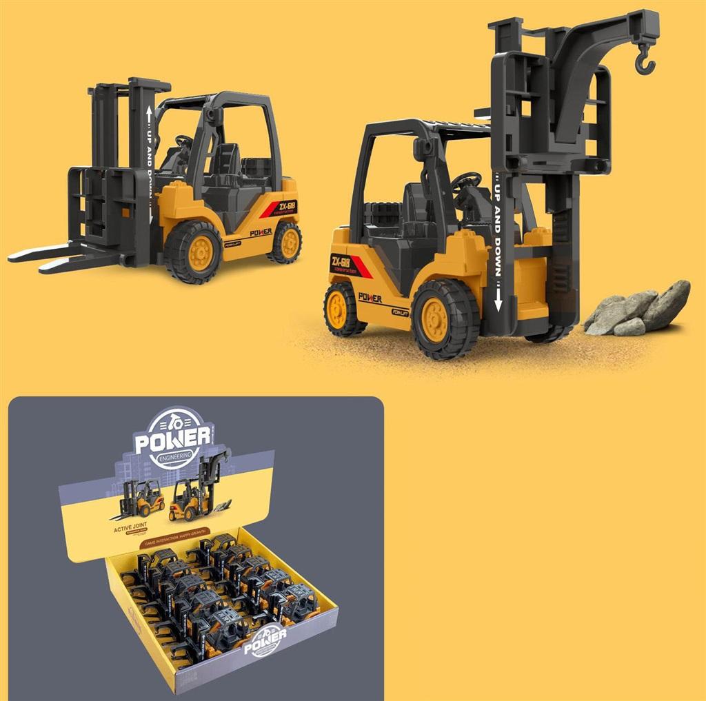 Plastikowy wózek widłowy z podnoszonym widlakiem.