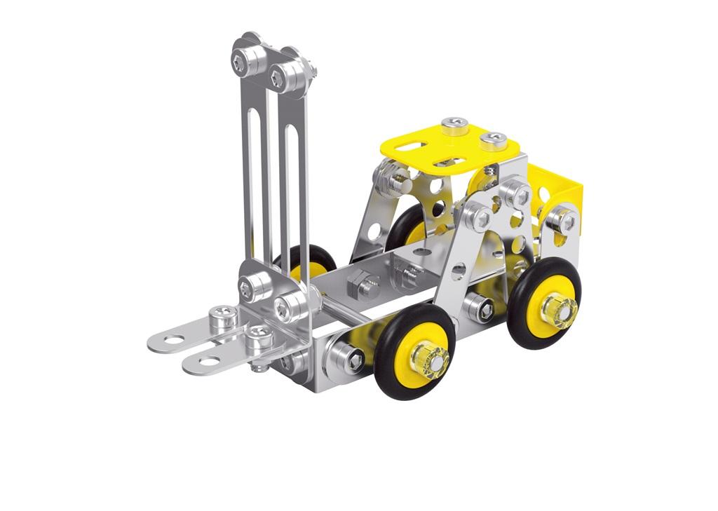 Wózek widłowy do składania dedykowany jest dzieciom powyżej 8 roku życia. W zestawie znajduje się aż 88 metalowych elementów, których połączenie wymaga skupienia i cierpliwości. Efekt? Żółto-szary pojazd z czarnymi detalami, który ucieszy każdego miłośnika motoryzacji i stanie się bohaterem wielu kreatywnych zabaw! Wózek stanowi dla rodziców i dzieci doskonałą okazję do wspólnej pracy. Mogą spędzać czas produktywnie i być dumni z własnych projektów. Realizację wyzwania ułatwia dołączona do zestawu przejrzysta instrukcja obsługi, w której zostały umieszczone wszystkie niezbędne kroki.