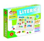 Zbiór kolorowych literek (zarówno wielkich jak i małych), z których każda posiada element umożliwiający wpinanie ich w otwory ażurowej tablicy.