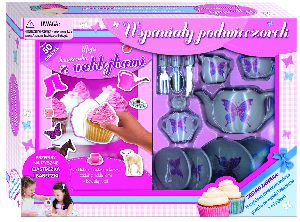 Ten zestaw to gratka dla dzieci, które uwielbiają urządzać przyjęcia dla swoich maskotek lub przyjaciół. Komplet zawiera 17-częściową miniaturową zastawę, książeczkę z przepisami na słodkie wypieki oraz książeczkę z naklejkami. Zestaw zawiera: imbryczek z pokrywką, dwie filiżanki, dwa spodki, dwa widelce, dwie łyżki, dwa noże, dzbanuszek na mleko, cukiernicę z pokrywką, dwa talerze, dwie książeczki. Zapraszamy na wspaniały podwieczorek z przepysznymi ciasteczkami!