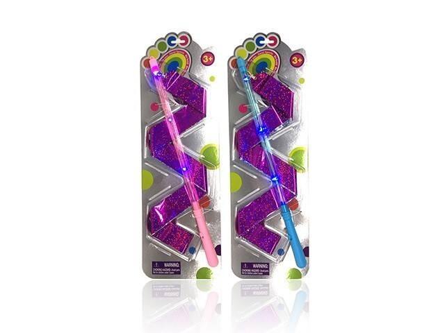 Laseczka posiada światełka, które migają. Wstążka jest odblaskowa. Wymaga użycia baterii 3 x AG13. Produkt przeznaczony dla dzieci powyżej 3 roku życia.