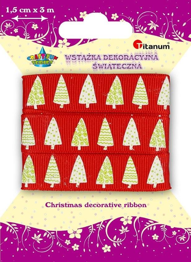 Wstążka dekoracyjna xmas, kolor: czerwony z nadrukiem choinek, 1,5 cm x 3 m.