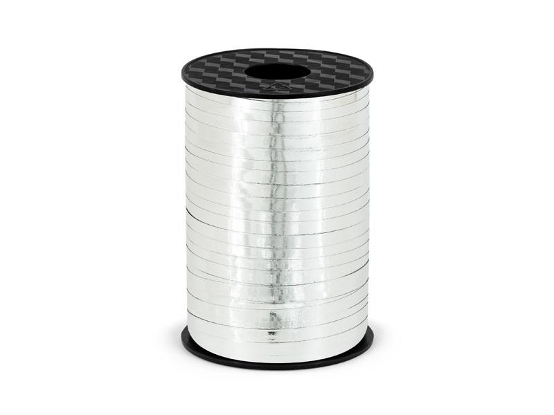 Wstążka plastikowa metalizowana w kolorze srebrnym, szerokość ok. 5 mm, długość ok. 225 m.