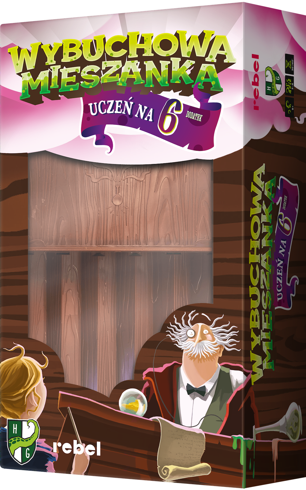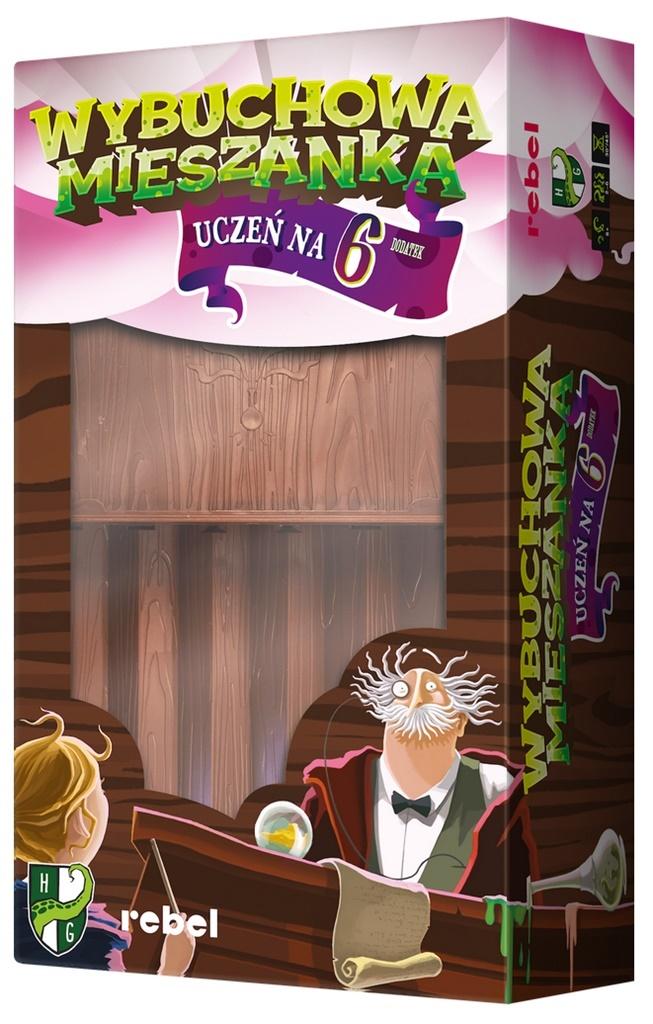 Nowa magiczna substancja i jeszcze więcej graczy przy stole! Drodzy uczniowie, dzięki Waszemu nieustającemu wsparciu Akademia przeszła niemałą przemianę! Rozbudowaliśmy sale lekcyjne, aby więcej uczniów mogło uczestniczyć w zajęciach. Zakupiliśmy też jeden z tych nowiutkich i lśniących podajników ingrediencji z ukrytą szufladką! Tegoroczny plan lekcji jest nieco bardziej wymagający, więc bądźcie gotowi na zmianę sal, gdy tylko zabrzmi dzwonek! Uczeń na 6! to rozszerzenie do gry Wybuchowa mieszanka. Zawiera nowe płytki eliksirów, których można używać wraz z tymi z gry podstawowej. Pojawiają się także nowe kulki dzikiej ingrediencji, które działają jak swego rodzaju dżokery podczas umieszczania na płytkach eliksirów, ale przy zderzeniu eksplodują tylko ze sobą. Dodatek wprowadza również możliwość rozgrywki dla 5-6 osób, podczas której na stole znajdują się 2 podajniki.