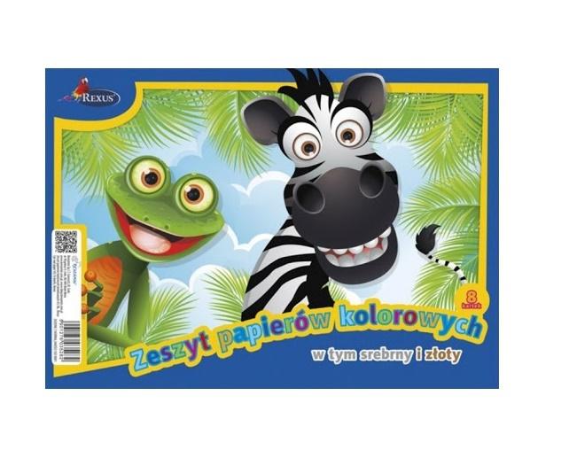 Wycinanka papierów kredowanych rozmiar A5- 8 kartek połysk w kolorach: czerwony, żółty, pomarańczowy, zielony, niebieski, srebrny, złoty, czarny. Na przedzie kolorowa okładka z nazwą produktu i kodem. Całość zszyta dwiema zszywkami płaskimi.OKŁADKA: kreda 115g, 4+0, ŚRODEK: kreda 90g, 1+0