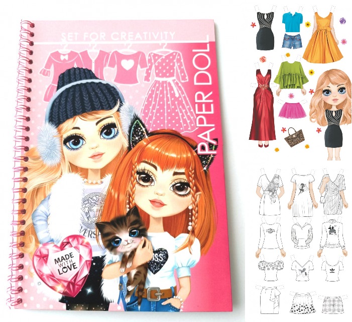 Papierowe lalki do zabawy. W środku znajdują się dwie modelki, które można ubrać w wycięte i pokolorowane przez siebie stroje. Wytnij je z książeczki, potem ubierz - zaginając specjalnie wystające kawałki papieru. Lalki i kostiumy mają wyraźne oznaczenia pokazujące, gdzie wyciąć, aby ubrania pasowały do lalek. Baw się nimi opowiadając najróżniejsze historie. Potem możesz przebrać lalkę i zacząć zabawę od nowa. Oprawa: spirala, wyprodukowano na Ukrainie.